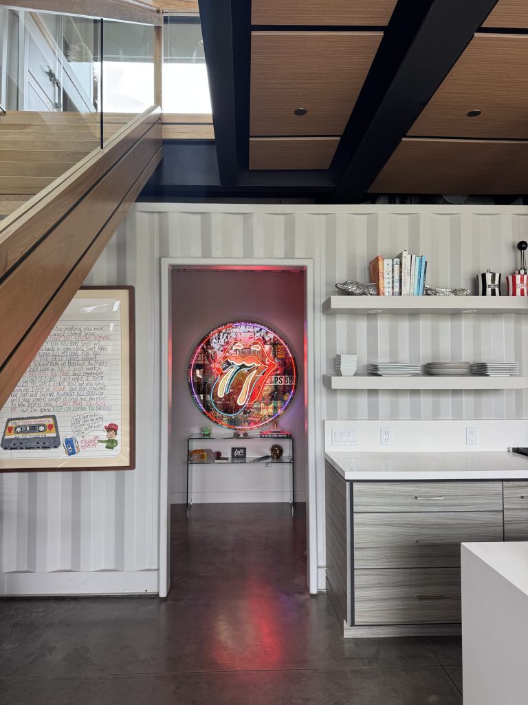 In all, the home is 2,400 square feet. Downstairs is the kitchen and living space. Upstairs is made up of two shipping containers parallel to each other with a hallway in between. One side fits two bedrooms with two bathrooms, while the other is the primary bedroom, which fits a king-sized bed. Bret notes that it’s not a massive bedroom, but “Who needs a huge bedroom, anyway? It’s just sleeping quarters.”
