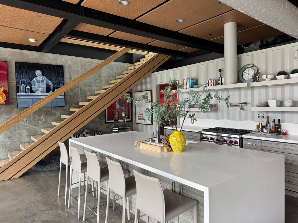 Despite its steel-and-concrete shell, the house feels warm. Barber incorporated wood elements into the ceilings and staircase, softening the space. Stone also gives a shout-out to interior designer Sarah McFadden of McFadden Design Group for her work.