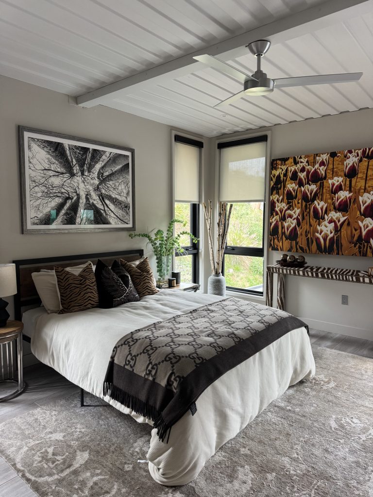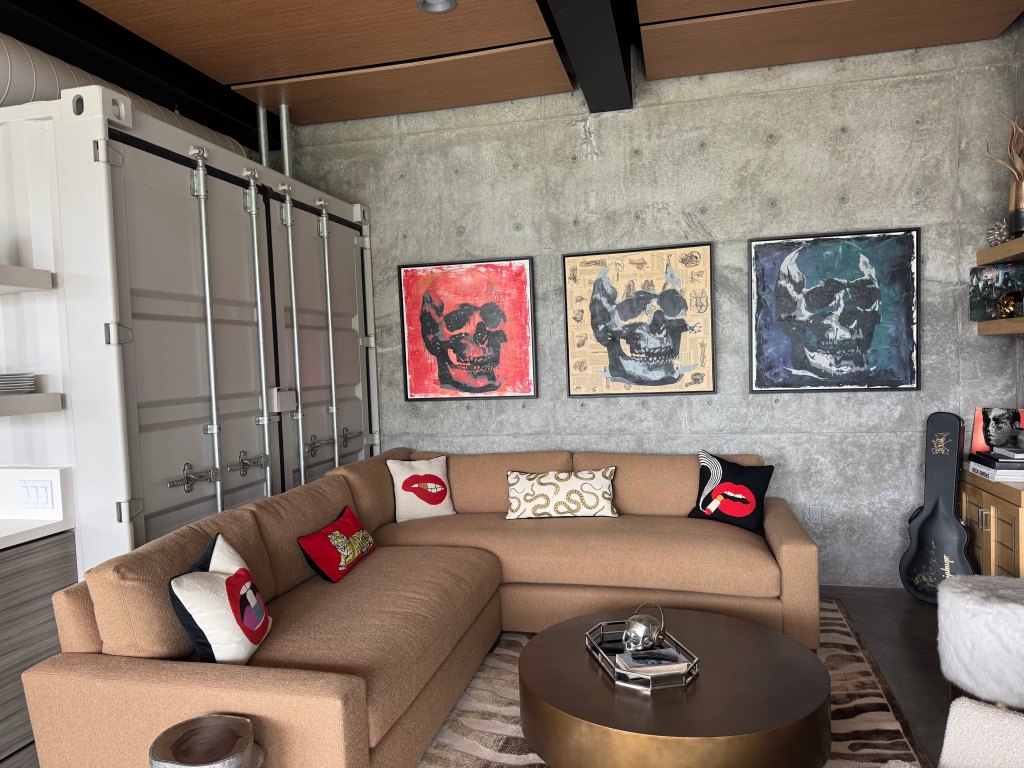 Rock ’n’ roll–themed artwork fills the otherwise spare walls. Bret credits the artwork to Dani, who he says loves rock ’n’ roll and runs a rockstar-inspired fashion brand called the Tribute Project, making one-of-a-kind jackets.