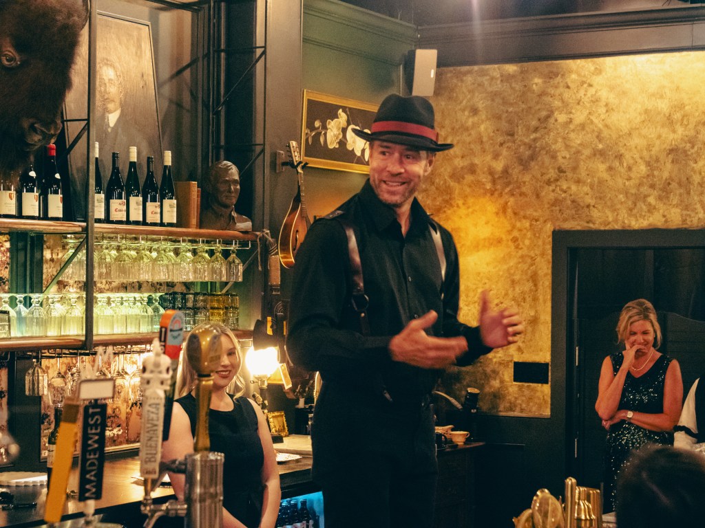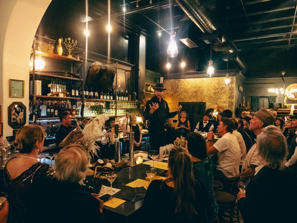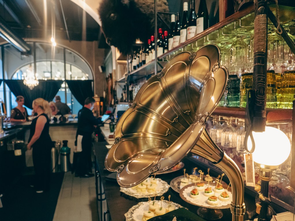 For locals, Beau captures something they’ve longed for — an approachable escape that still feels both lavish and intimate. The first time one steps into the bar, whether clad in 1920s glamour or just everyday wear, it feels like something special is happening here. Inside lies a treasure trove of secrets waiting to be unveiled as guests are transported into a 1920s speakeasy, with a working gramophone playing soft tunes, coupes filled with champagne, a darkly wooden interior bar at the center, and knickknacks on nearly every wall.