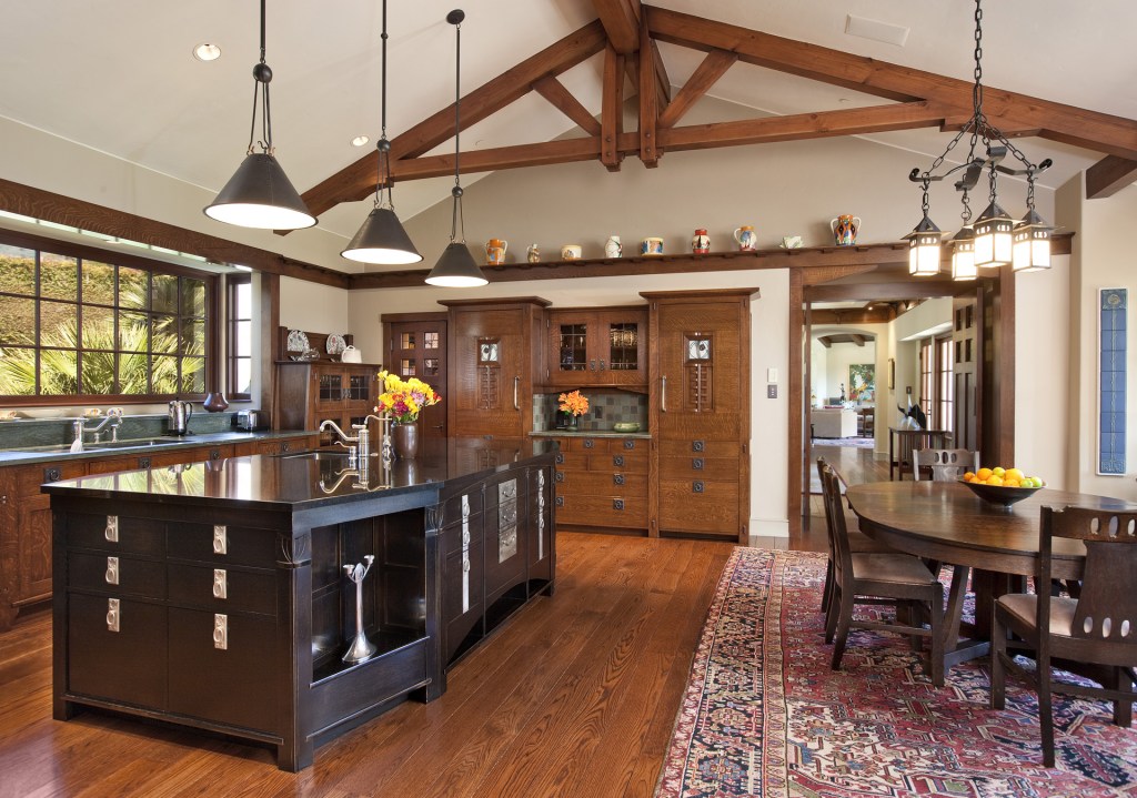 MONTECITO MODERN: Built in the 1940s and updated a few times along the way, this classic Craftsman offered a broad layout with enough square footage to hold its new owners’ extensive art collection. During its comprehensive remodel — which included replacing the original sandstone foundation — the home became a piece of art itself, featuring handcrafted detail by some of Santa Barbara’s finest cabinetmakers (shown in this image of the kitchen), iron sculptors, stonemasons, and other artisans. Architecture and design by Britt Jewett and Ketzel & Goodman. Interiors by Christopher Teasley.