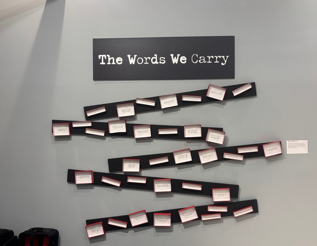 The exhibit is multi-media in scope. Among the pieces is a recording of a nightmarish 9-1-1 call from a six year old; other works portray personal experiences through art and collage. They are a representation of the journey more than 600 children endure each year, as well as portrayals of their successes.