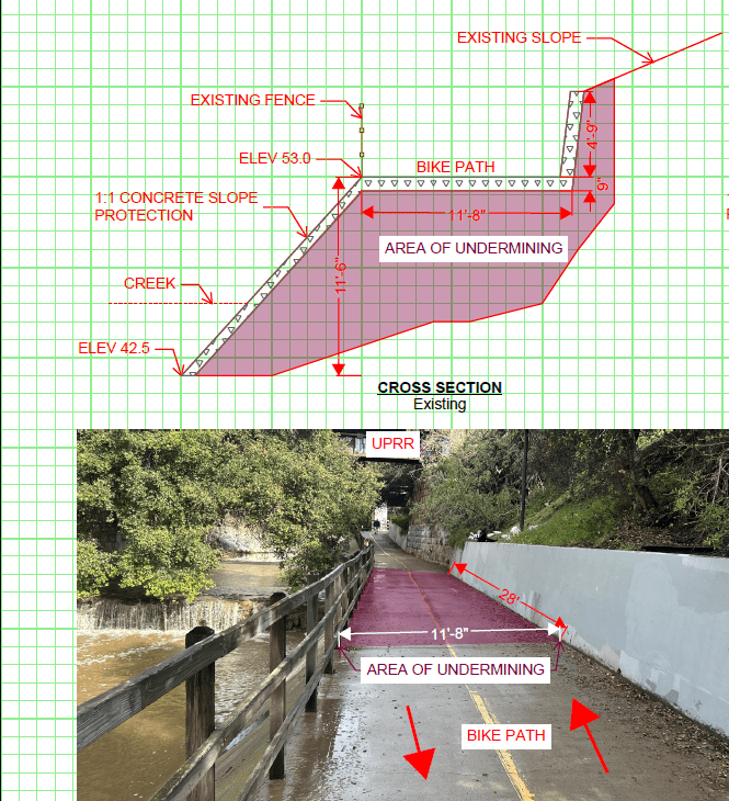 Storm damage had undermined a section of the path near the U.S. 101 undercrossing, leading to the path’s closure with barriers installed to keep out foot and bike traffic. Travelers on the path were re-routed to Turnpike or Patterson Avenue.
