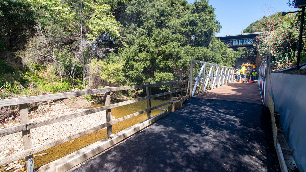 After a months-long closure, Santa Barbara County Public Works staff have built a temporary bridge to reconnect the Maria Ygnacio bike path under the U.S. 101 freeway in Goleta.