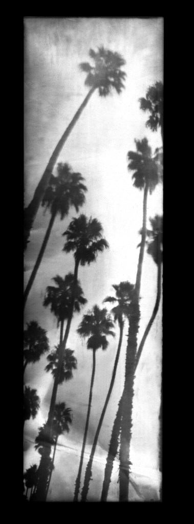 At times, the unstable images seem akin to negative prints themselves, so it is not too jarring to suddenly find a set of negative images on one stretch of wall. Among other things, these images alter what we know about the Goleta Beach palm trees or the well-known pyramid-shaped tomb at the Santa Barbara Cemetery.