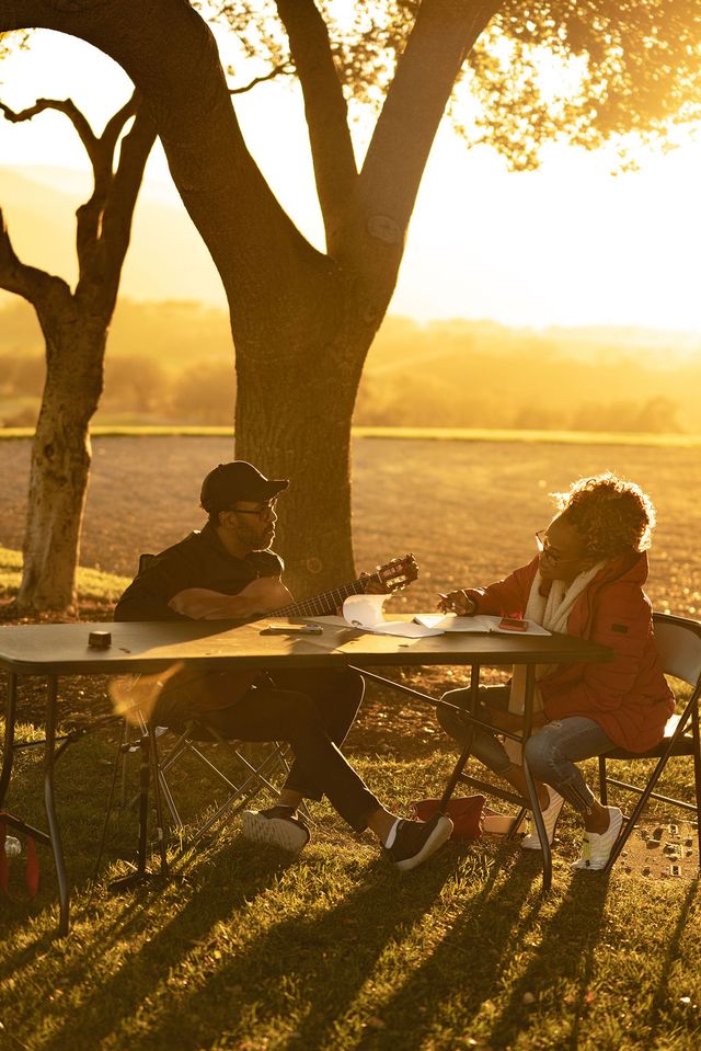 Songwriters Will Stephens (left) and Lois Mahalia (right) work together outdoors during a golden-hour writing session, developing the song “Lead with Passion” inspired by first responder Denise McDonald, the head ER nurse at Santa Barbara Cottage Hospital. Credit: At Ease International