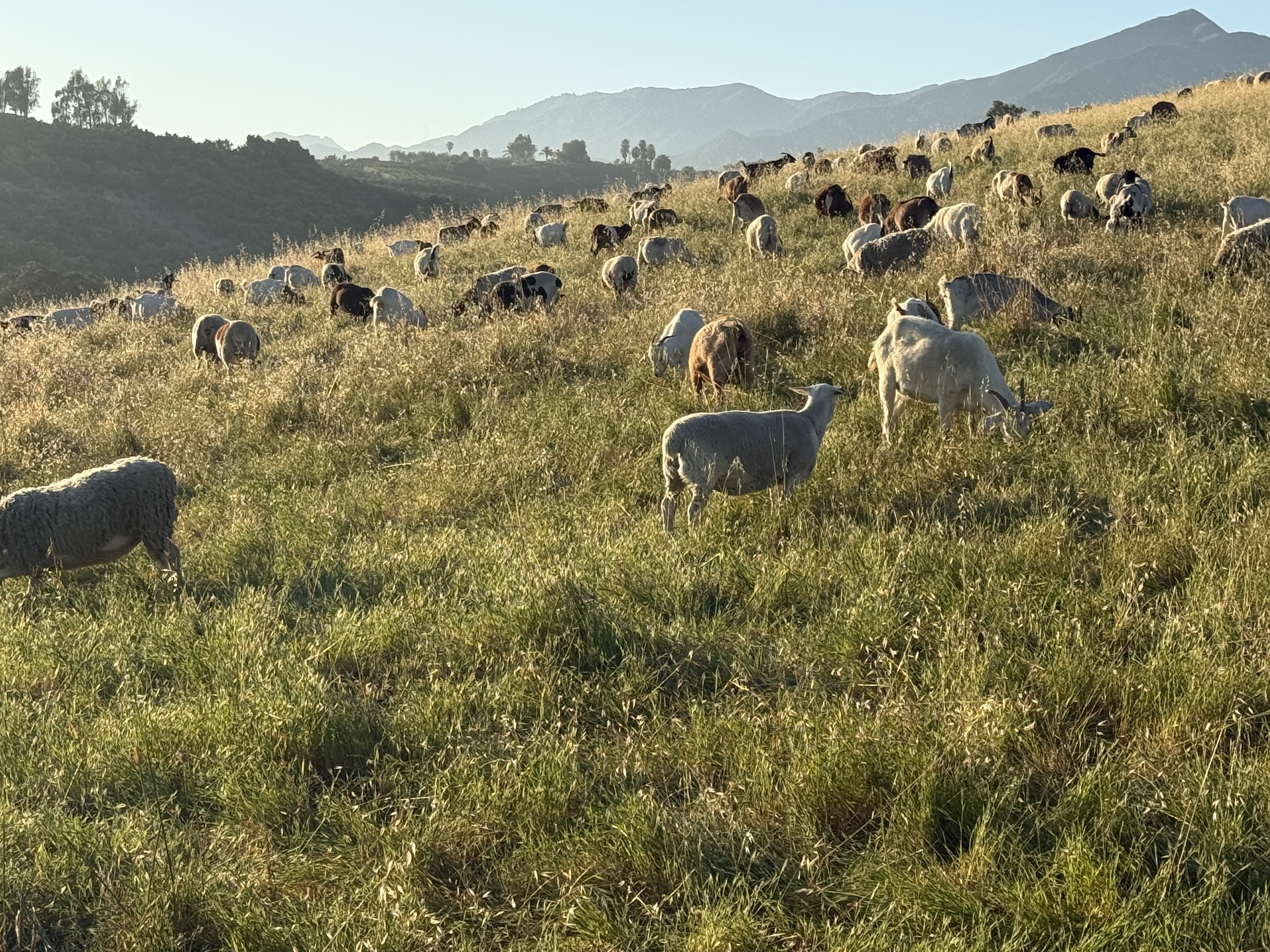 Enchanted by this discovery, I made it a daily destination as the animals moved to different areas of the hills over two weeks. I had a very informative talk with Camila Schafer, a firefighter-paramedic in Carpinteria, who was previously a shepherd for Cuyama Lamb LLC. The Summerland project covered 31 acres in just four weeks, “staffed” by 400 goats and sheep, with a ratio of 85 percent goats to 15 percent sheep. During that time, about 24 babies were born in the herd.