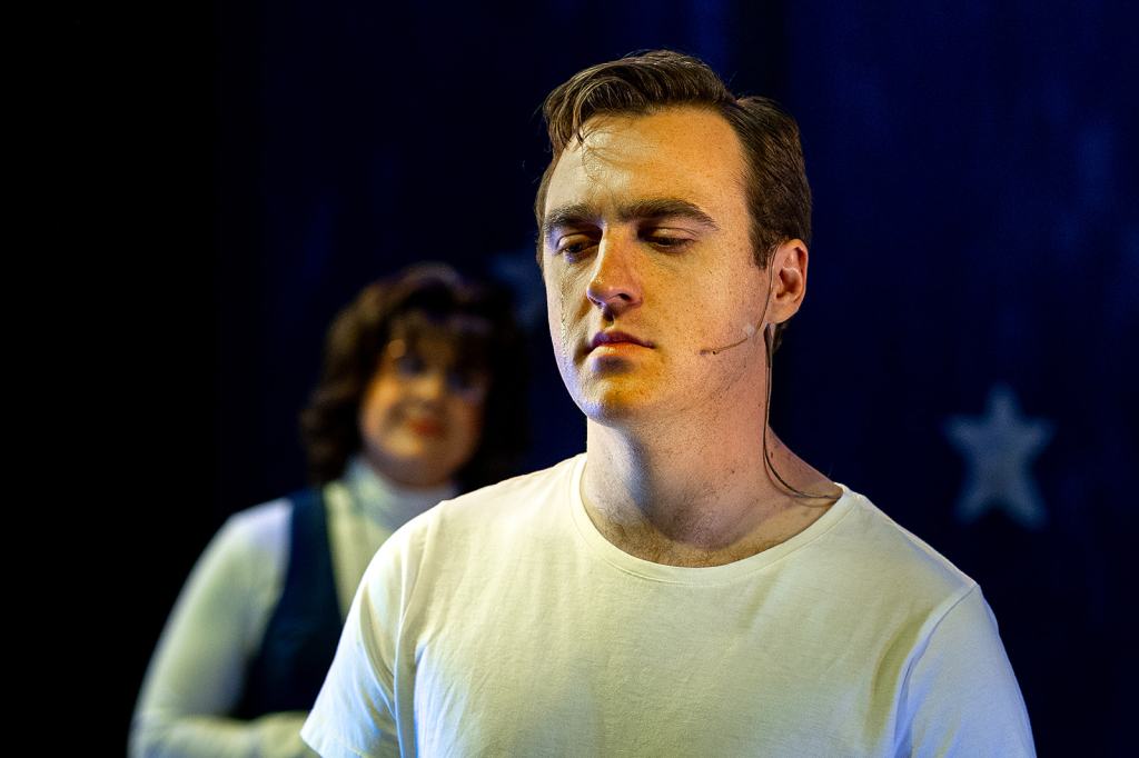 The show looks at American culture’s bad (poverty, civil unrest, mental illness) and ugly (guns). Of the nine assassins, the most weight is given to John Wilkes Booth (Brian Hoyson), who plays a devil on the shoulder of characters in need of murderous inspiration; and Lee Harvey Oswald (Ryan Beaghler), blamed for punching a hole in the white picket fence of America’s post-war suburban glow. Beaghler’s voice was tenuous (after a week of run-throughs, vocal fatigue is a real issue), but the control he exercised to stay on the ledge gave Oswald an edge, adding interesting tension to the scene.