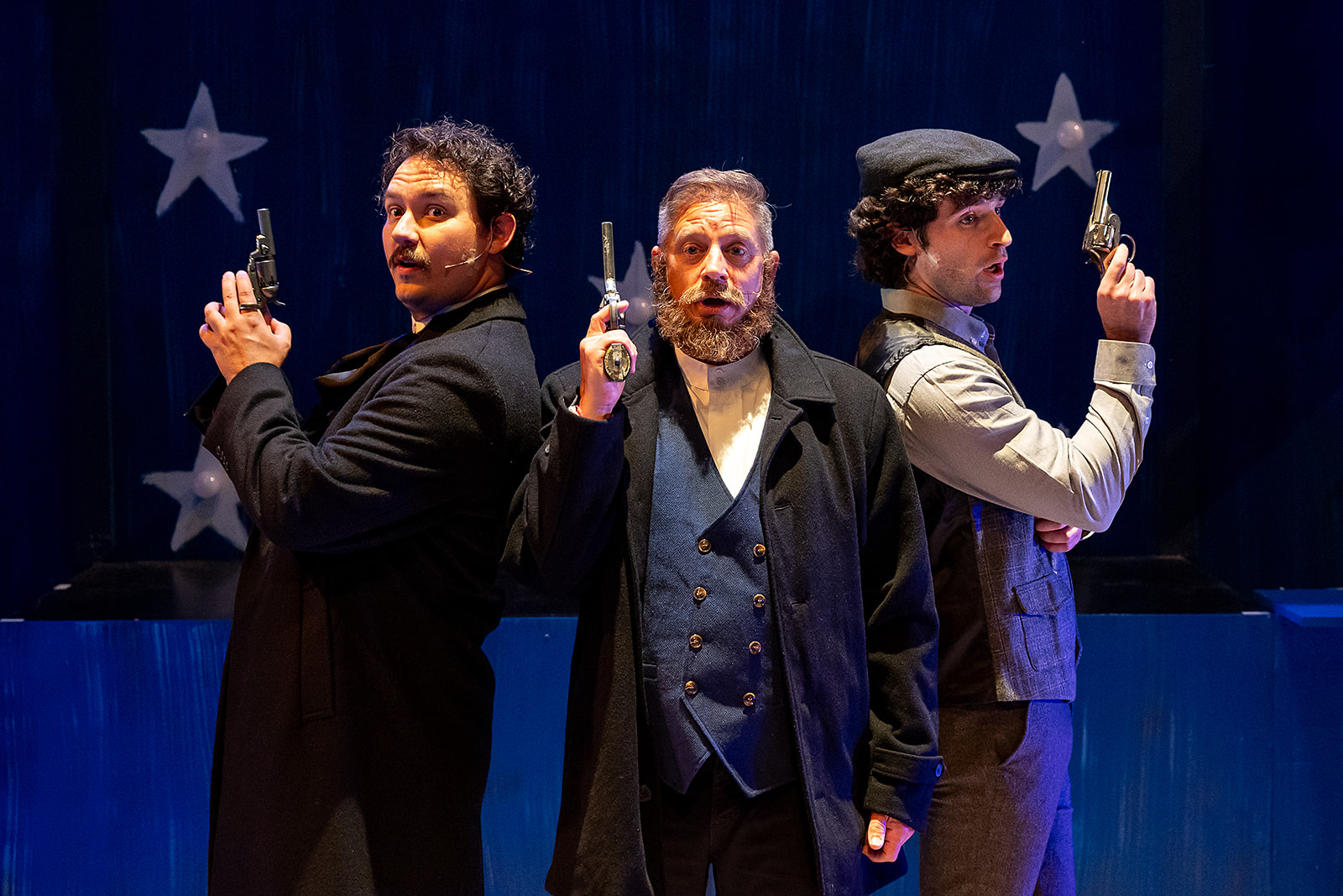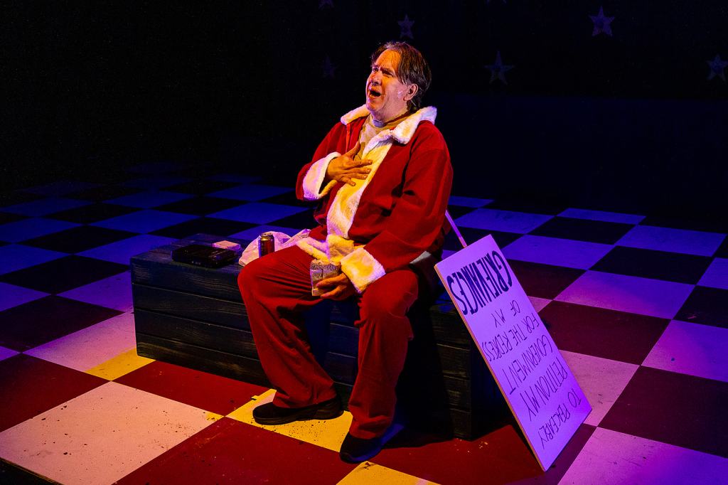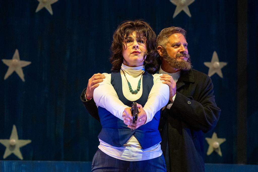 Brian Hotchkin, the sinister “Shoot a Prez, Win a Prize” proprietor, sets the tone for this freakshow of misunderstood souls. Rob Grayson shows off a powerful voice as would-be French ambassador Charles Guiteau, hawking his memoirs on the way to the gallows. The show’s comedy duo of ineptitude, Sara Jane Moore and Squeaky Fromme (Marisol Miller-Wave and Naomi Jane Voigt), are two very different women with the same dark interior monster. It’s nice to see Miller-Wave, who is almost unrecognizable as a “square” 70s housewife, getting the chance to show her range as an actress.