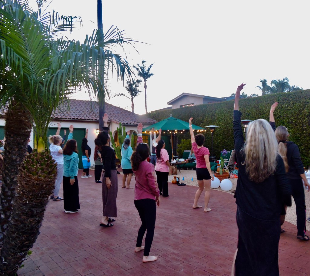 In front of a so-called patron-of-the-arts house — a white Spanish-style ranch home where string lights draped from palm trees to patio umbrellas, the air was thick with sea salt and Hawaiian music flowed from a speaker. About 20 dancers stood in two rows, most in Hula Anyone T-shirts washed in faded pinks and turquoise. A few people watched from lounge chairs while the dancers told stories with their hands. The whole scene felt warm, calm, happy — sweet like a coconut.