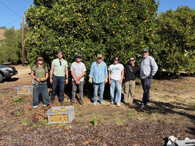 Veggie Rescue staff and volunteers, alongside members of the Santa Ynez Valley Rotary clubs, came together this morning to harvest 350 pounds of fresh oranges at Rancho Tajiguas on land stewarded by the Gaviota Coast Conservancy. The fruit was quickly distributed to nonprofit partners in the Santa Ynez Valley, Lompoc, and Santa Barbara serving individuals and families experiencing food insecurity.