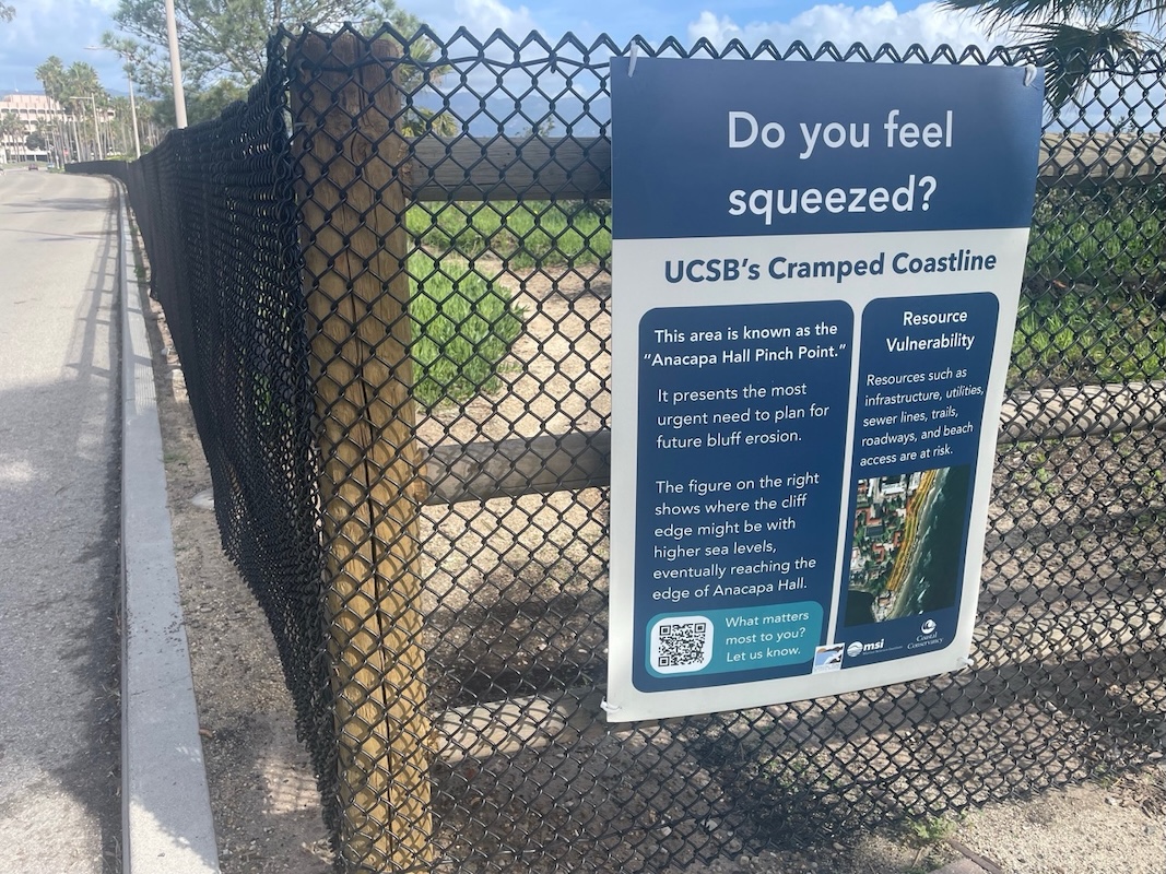At the University of California, Santa Barbara campus, that question is posted directly onto a fence now set back from the bluff in front of Anacapa Residence Hall — a fence that, until recently, sat closer to the edge. The relocation is part of the university’s Sea Level Rise Adaptation Strategy and its public outreach effort — a way of making visible what is otherwise incremental and easy to ignore: the coastline is moving.