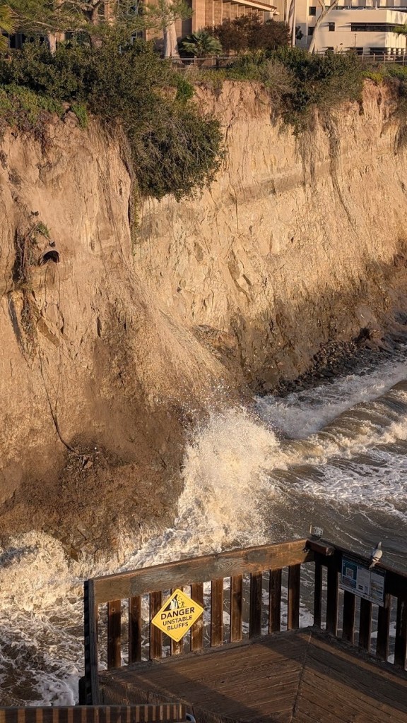 Along Del Playa Drive, that reality is very much visible. Decks have collapsed into the ocean. Sections of bluffside access have eroded away. Homes sit close to edges that shift each winter under wave action and storm surge. Since the 1990s, more than a dozen students have fallen from these bluffs — many fatally — the risk shaped by both behavior and the narrowing space between infrastructure and a 30-foot coastal cliff.