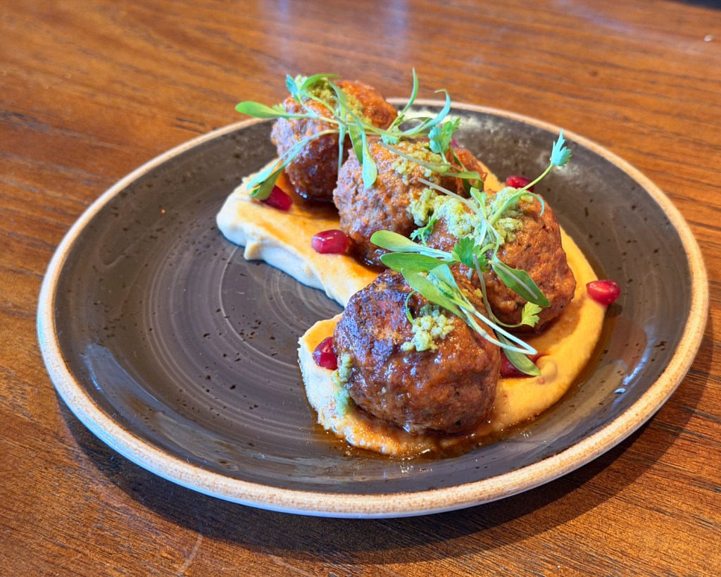 The three starter options give an excellent variety of flavor. On the lighter side, the charcoal avocado salad is bursting with citrusy zing. Half an avocado — blackened from a charcoal grill — gives the salad a uniquely savory depth. If you’re in the mood for something more hearty, McNee’s lamb meatballs served on a spread of pureed chickpeas complete with a sprinkle of pomegranate seeds is sure to satisfy. Or, guests can opt for a Chioggia beet and burrata deconstructed salad, which mixes earthy beet, rich butternut squash, and crisp apple, harmoniously checking all the flavor and texture boxes.