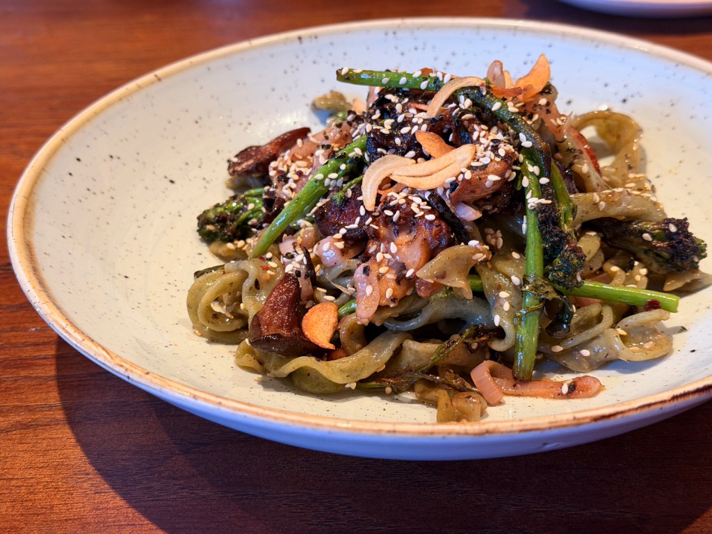 McNee says the seaweed mafaldine pasta dish is “definitely the nomad of nomad Italian.” Seaweed-infused homemade noodles are caressed in a sesame seed and miso butter, then tossed with flavor-packed mushrooms, al dente broccolini, and pickled then sauteed shallots whose bright acidity provides a pleasing contrast to the deep umami flavors.
