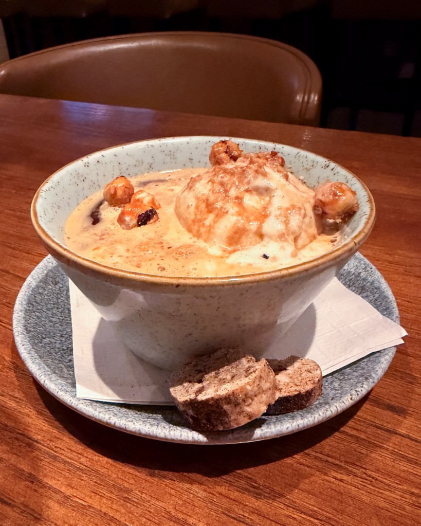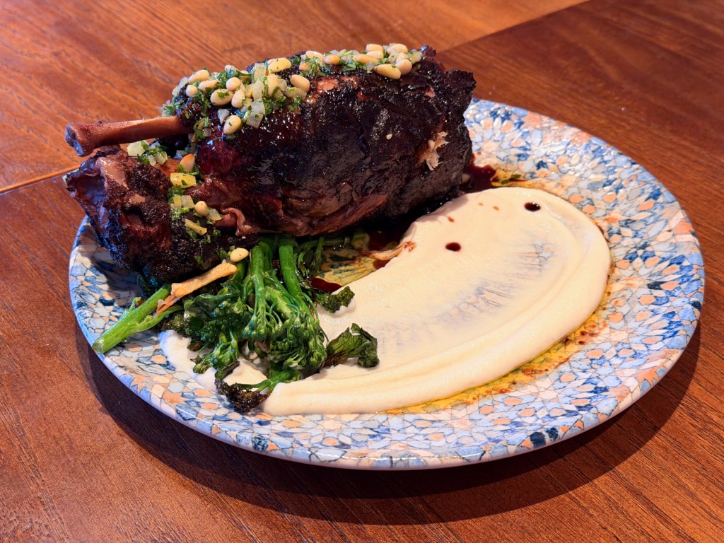 The stinco far exceeded expectations — and it is a special feature, since the dish is not normally on the menu. Two days of preparation go into this braised pork osso bucco, leaving it so tender the meat falls right off the bone — no knife needed. Paired with a pine-nut salsa rustica and broccolini, this buttery pork really is the star of the show.