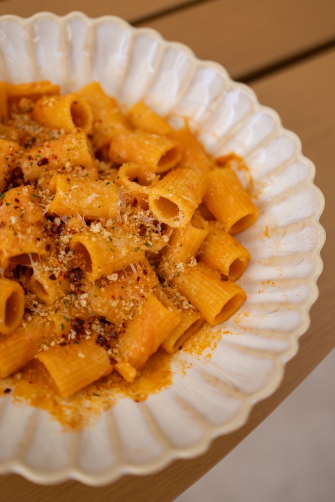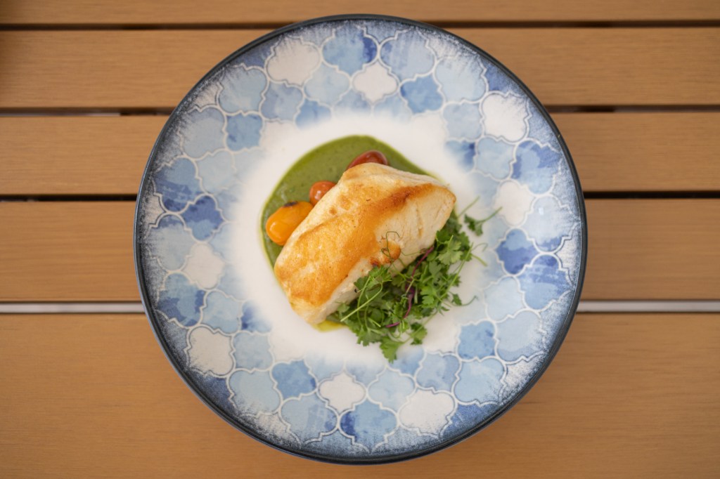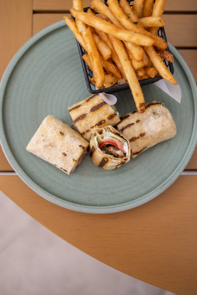 Next came the main course: a choice between the chicken souvlaki wrap with yogurt marinade, tomato, cucumber, mint, and a side of fries or tabouli salad; the ouzo rigatoni with tomato, chile, and kefalotyri cheese; or the California seabass with green harissa, charred tomato, olive, and cauliflower — cooked to perfection.