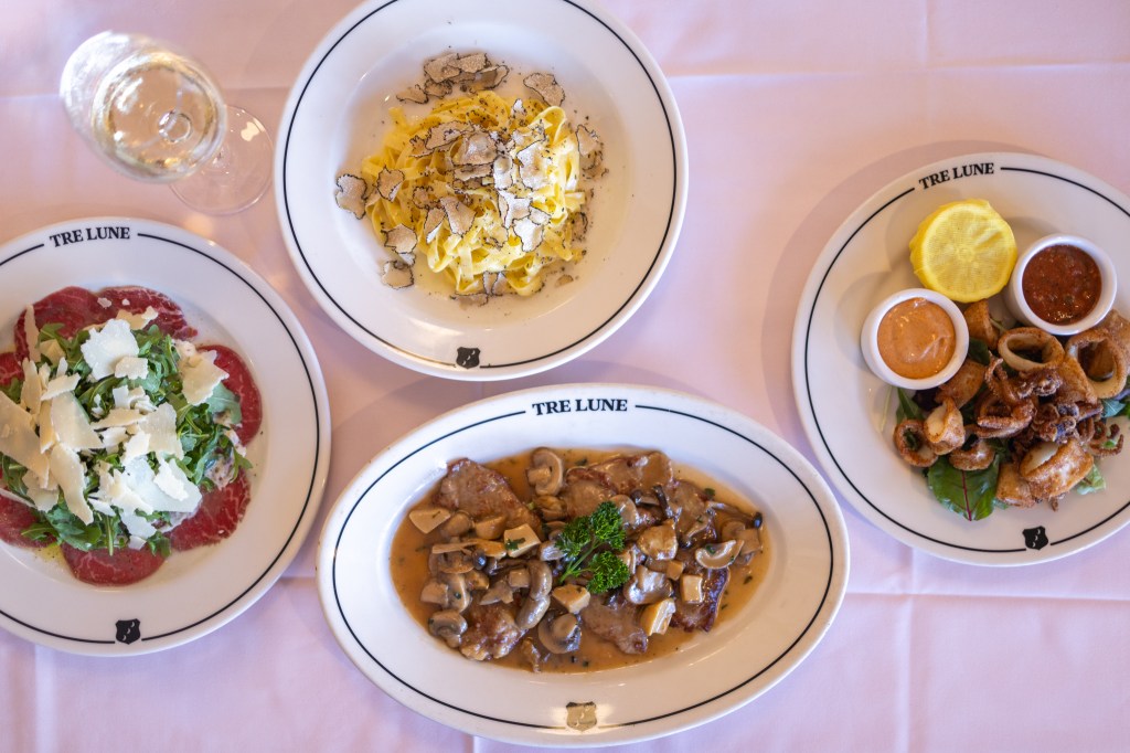The meal begins with choices that cover Tre Lune’s menu highlights. The carpaccio di manzo — thinly sliced filet mignon topped with arugula, shaved parmesan, and mustard dressing — is bright and clean, the olive oil flavorful. For those leaning toward the sea, the fritto calamari comes lightly crisped, paired with marinara and aioli, more delicate than greasy.
