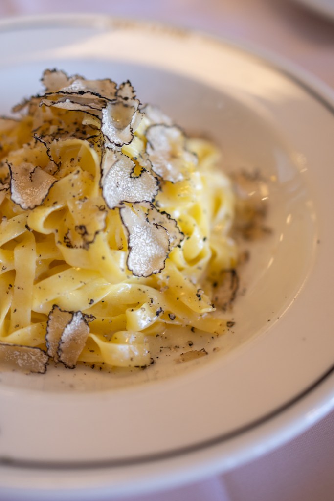 Then there are the main events. The fettuccine al tartufo is simple and decadent — pasta glossy with butter and loaded with shaved black truffle. This, thank the heavens, they do not skimp on. The battutine al Marsala e funghi, a sautéed veal with mushrooms in a rich wine sauce, lands heavier — savory, silky, and again, wonderfully buttery. Another option is the branzino, a mild and flaky white fish, with a lemon and caper sauce.