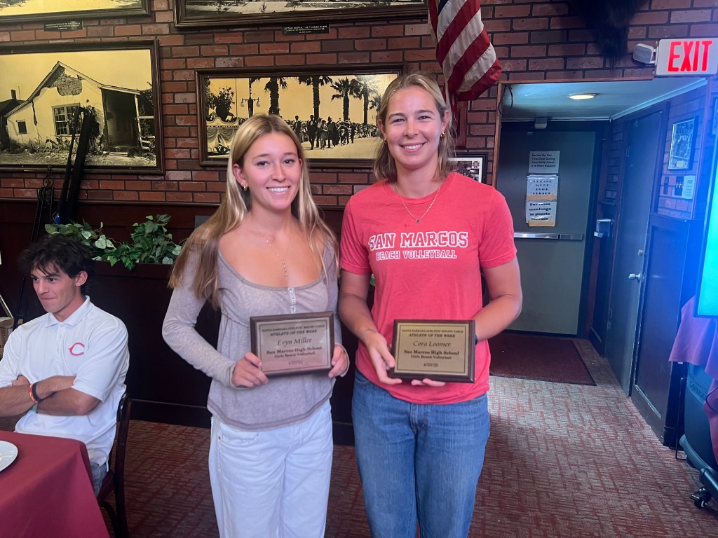 Cora Loomer and Evelyn Miller of San Marcos High beach volleyball were honored as SBART Athletes of the Week after winning the Channel League individual pairs title. The duo also went undefeated in Channel League play and led the Royals to a third consecutive undefeated team run through league competition.