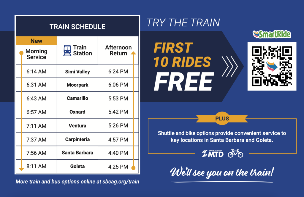 As an incentive to get cars off the road, SBCAG is offering those who commute to Santa Barbara County a $50 voucher — enough to pay for 10 rides (five round trips) from Ventura to Santa Barbara — by signing up through SmartRide.org. If riders log five trips on SmartRide, they are eligible to receive another $50 voucher, giving them even more free rides.