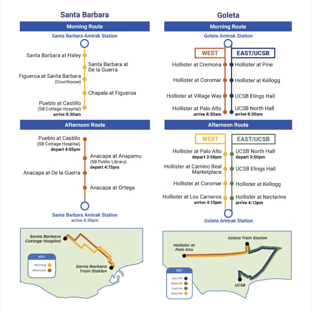 Once passengers arrive in Santa Barbara, three free MTD shuttle services are available to get riders closer to their final destinations. One will service Santa Barbara, and two for Goleta. Shuttles are scheduled to run twice per day around the peak-hour Amtrak service.