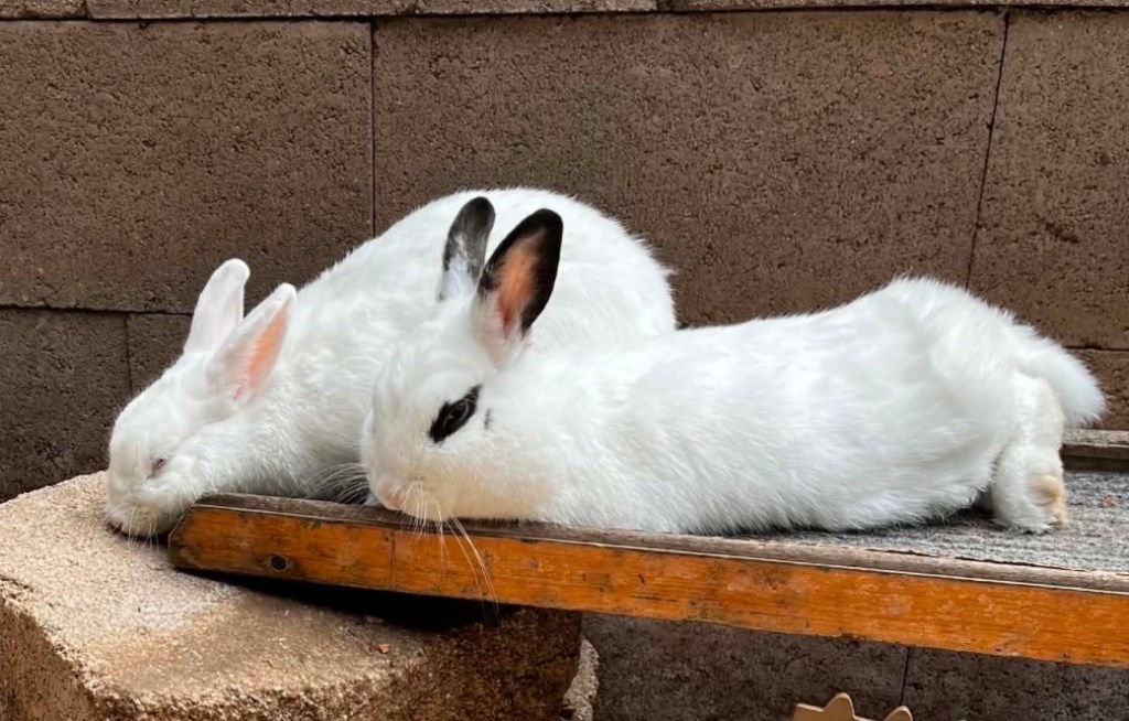 These two bonded sisters are under a year old. They look quite sleepy and relaxed but are also active and curious busy-bodies or should we say, busy-bunnies! Clara is snow white all over and Mia is the has glamorous black ears and “eyeliner.” These girls get along well and are gentle and cleanly. Who could ask for more in a bunny pair!