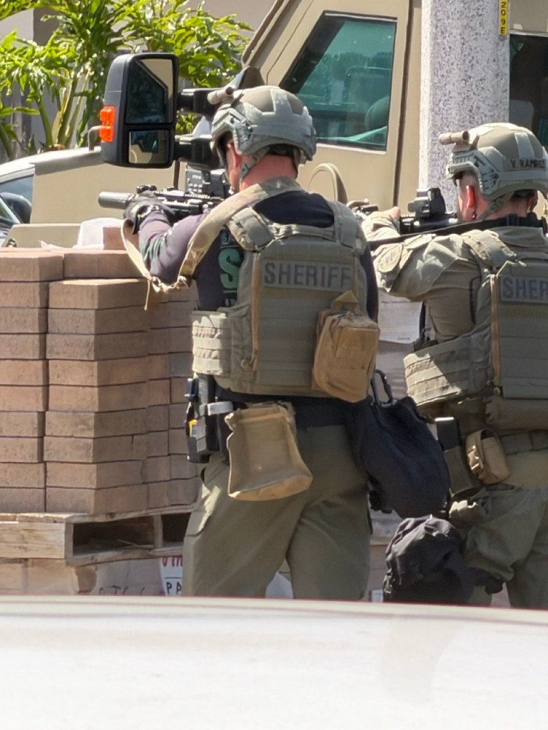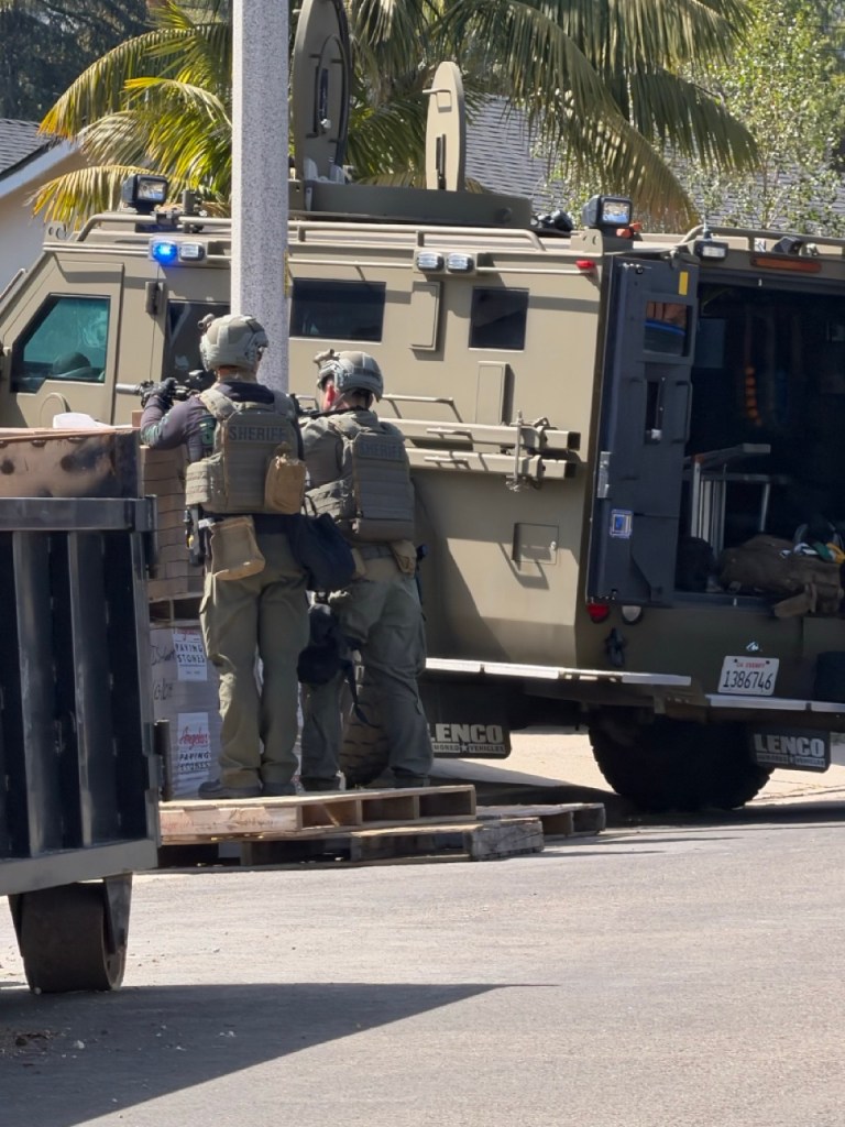 Lopez was not located at the residence, but the operation prompted a large law enforcement presence in the area, including what witnesses described as an armored vehicle and an apparent standoff. The Sheriff’s Office issued a public advisory that Camino Cascada and Cathedral Oaks Road were closed to traffic “for safety and to allow access for responders,” while a nearby after-school program was placed in a precautionary hold.