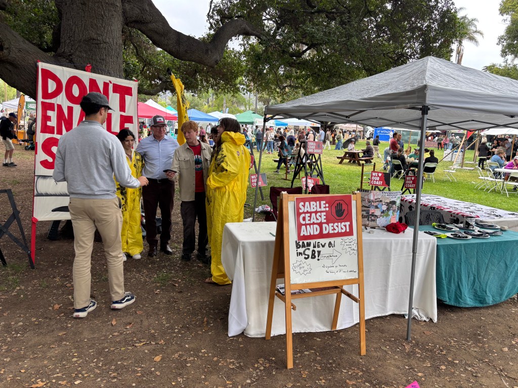 Many attendees sported fish and whale hats, thanks to rangers from Los Padres National Forest, who gave out trout-shaped hats to highlight the endangered steelhead recovering in the forest’s waterways, and staff from Blue Whales Blue Skies, whose blue-whale-shaped paper hats celebrated the program’s efforts to reduce fatal ship-strikes on vulnerable cetaceans. One eye-catching booth, manned by high schoolers, was dedicated to fighting big oil — including “Don’t Enable Sable” signs, referring to Sable Offshore Corp. and its restart of oil production and a once-ruptured pipeline snaking through the Gaviota Coast. It was a reminder of the early days of Earth Day, which is widely acknowledged as beginning in Santa Barbara after the devastating 1969 oil spill off its coast.