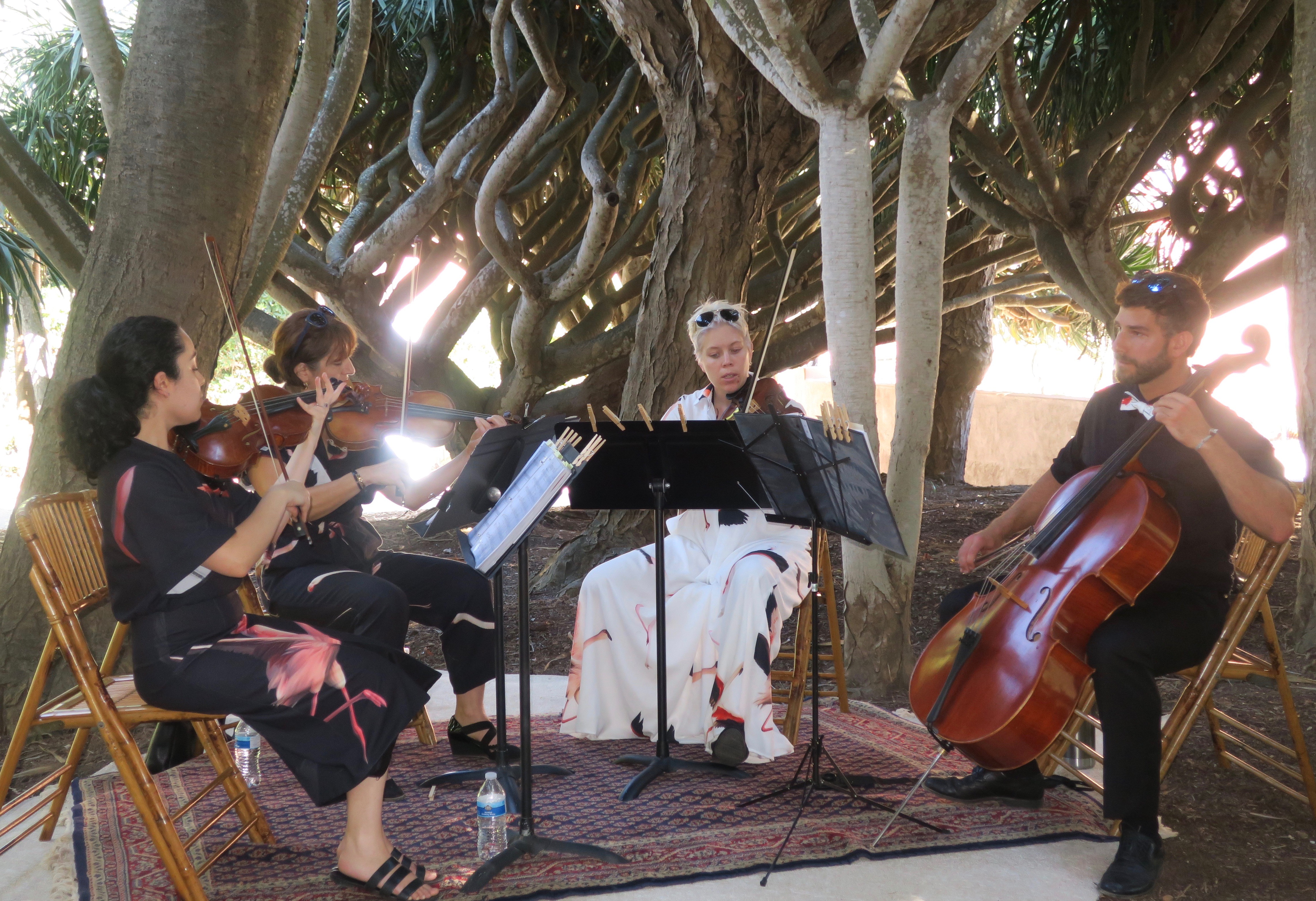 Japanese classical dancer Nancy Hayata performed at the edge of the koi pond in the magnificently restored Japanese Garden, while in the Dracaena (Dragon Tree) Circle, the Santa Barbara Symphony String Quartet entertained. Outside the Main House, guests were bid to help themselves to a Japanese Good Fortune from hundreds of printed fortunes on display.