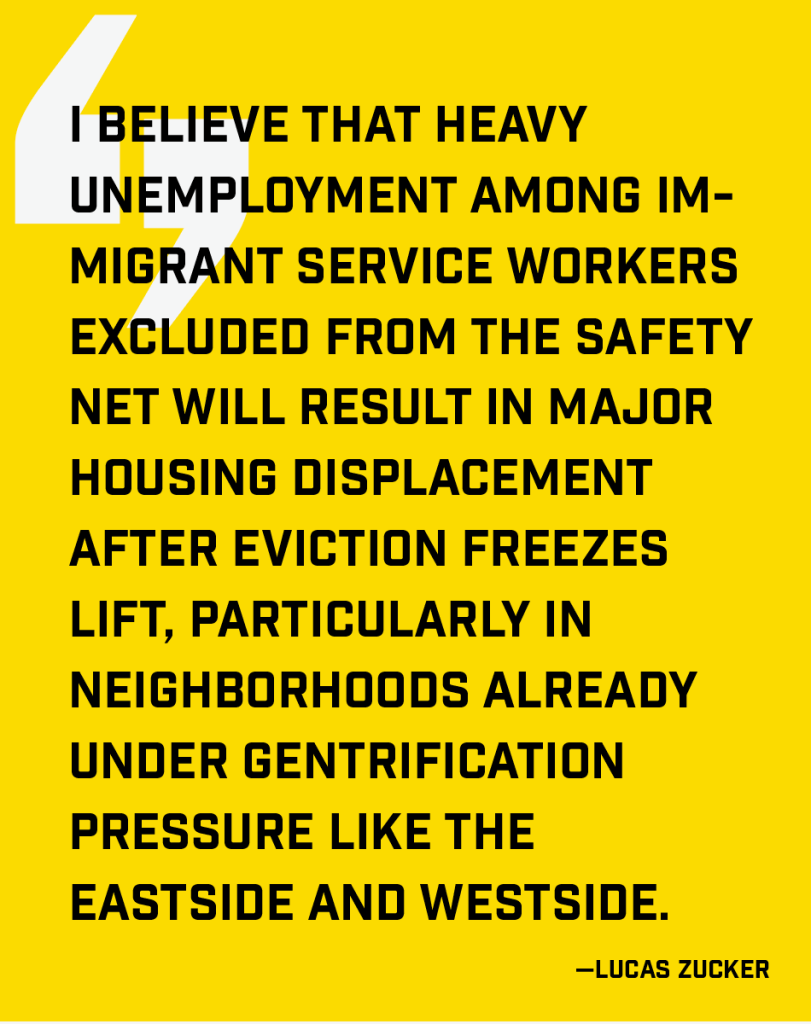 I believe that heavy unemployment among immigrant service workers excluded from the safety net will result in major housing displacement after eviction freezes lift, particularly in neighborhoods already under gentrification pressure like the Eastside and Westside.