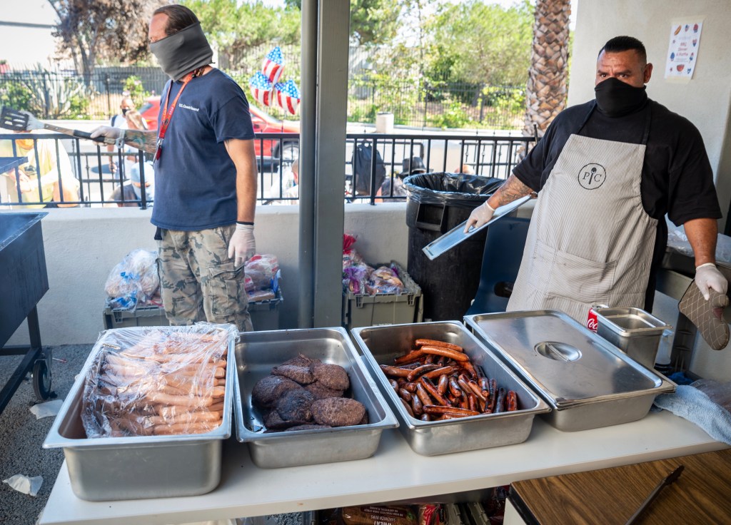Even in the midst of the pandemic, the Santa Barbara Rescue Mission continued its 4th of July tradition of welcoming homeless guests to its Yanonali Street facility for a barbecue dinner — the all American hamburger and hot dog and plenty of sides. About 130 guests, from those in their twenties to those in the seventies and including at least 10 veterans, came to this festive event.