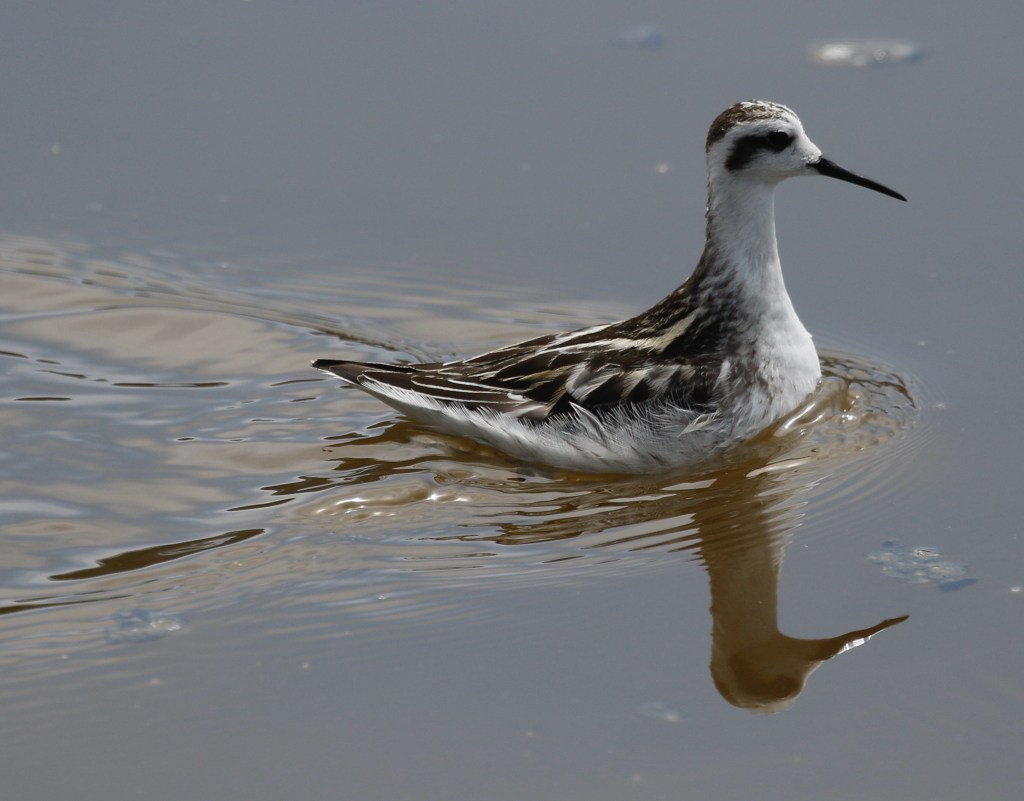 Red-necked phalaropes only have the red throat in the spring and summer months; they lose the color in the fall, but they are still very elegant in their gray, black, and white plumage. Phalaropes, of which there are three species, are unusual in that the sex roles are reversed. Females are larger and more brightly colored than the males. After she has laid her eggs on the shore of an Arctic pond, he incubates the eggs and takes care of the young while she will often find a new mate to raise a second brood.