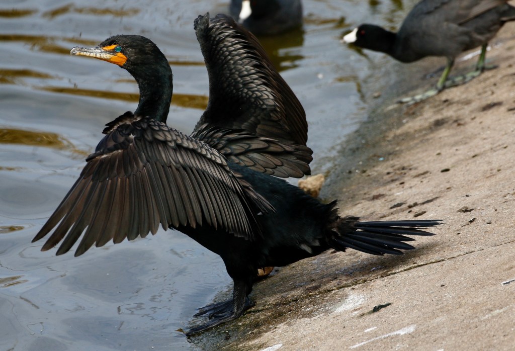 Other ducks often found at Lake Los Carneros include cinnamon and green-winged teal, ring-necked duck, and gadwall. A year-round resident is the North American ruddy duck. In the spring, the male develops an improbable sky-blue bill. Other water birds include the resident pied-billed grebe and American coot, the latter whose white beak is unique among the water birds. Double-crested cormorants will often perch along the concrete dam drying their outstretched wings after a spot of fishing.
