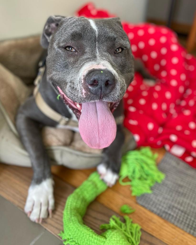 Lexi is smart, fun, and beautiful. She is house trained and 100 percent snuggles. Someone needs to swoop this girl up ASAP to be the luckiest person ever. Lexi is about 2 years old and weighs 72 pounds. When she’s on walks and sees other dogs, she does plenty of friendly tail wags. Don’t let her lovely blockhead deter you – she is a lap dog and cuddle monster wrapped up in a strong body, and she’s ready to be your best friend.