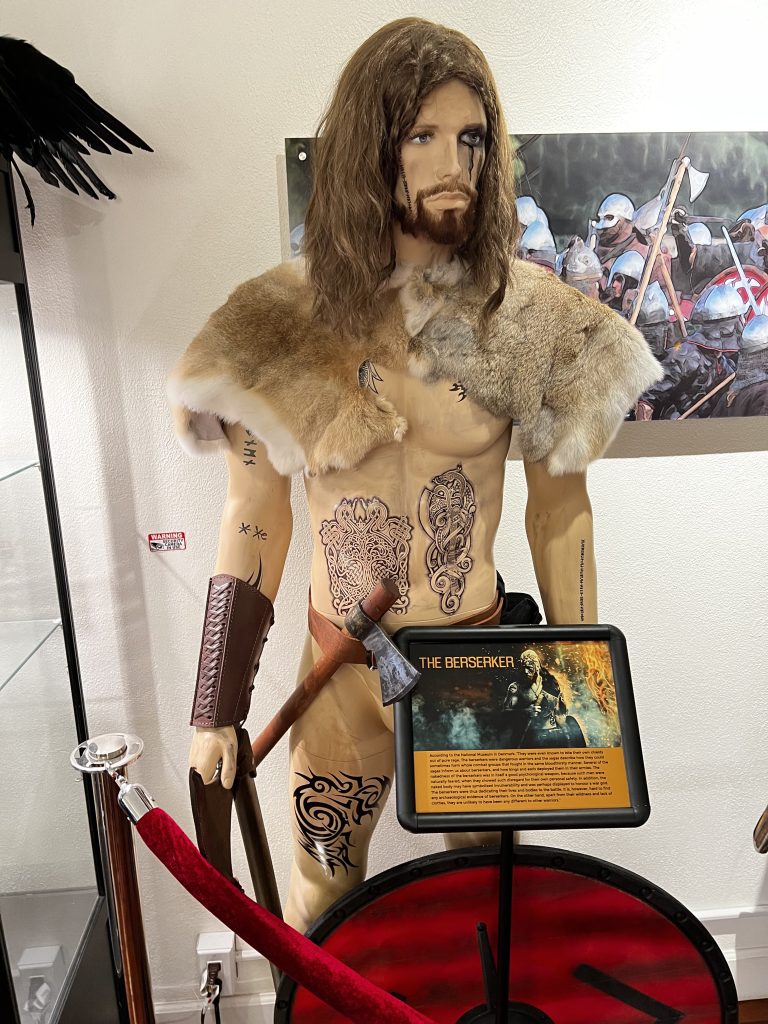 Inside the museum, visitors step back in time — more than 1,000 years in the past — and view ancient Viking artifacts such as three swords dating back to 800-950 AD, arrowheads, coins depicting the god Odin, burial urns, and even a first edition of Gesta Danorum — “Deeds of Danes” — printed in 1575. There’s even a life-size berserker figure wearing little else but a shield for protection.