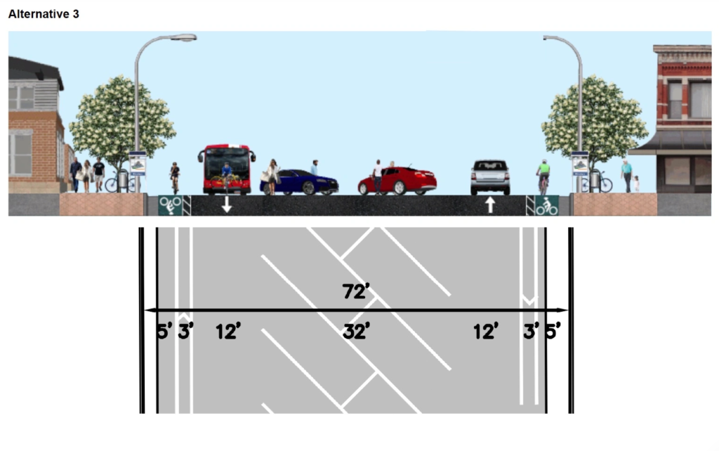 Alternative One added back-in diagonal parking to the north side of the street, left parallel parking on the south side, and added bicycle lanes and a 3.5-foot buffer between bikes and cars — for 25 added parking spaces. Alternative Two added traditional diagonal parking on the north side with a bicycle lane between the cars and the curb, and the south side remained parallel parking, for a loss of 20 parking spaces. The loss was due to sightline issues for cars coming out of the side streets and having to see past the diagonally parked cars. Both alternatives left one center turn lane.