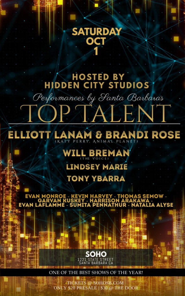 Santa Barbara’s Top Talent Event takes place at SOhO Restaurant and Music Club (1221 State St.) Saturday, October 1, at 7 p.m. Tickets are available for purchase at sohosb.com.