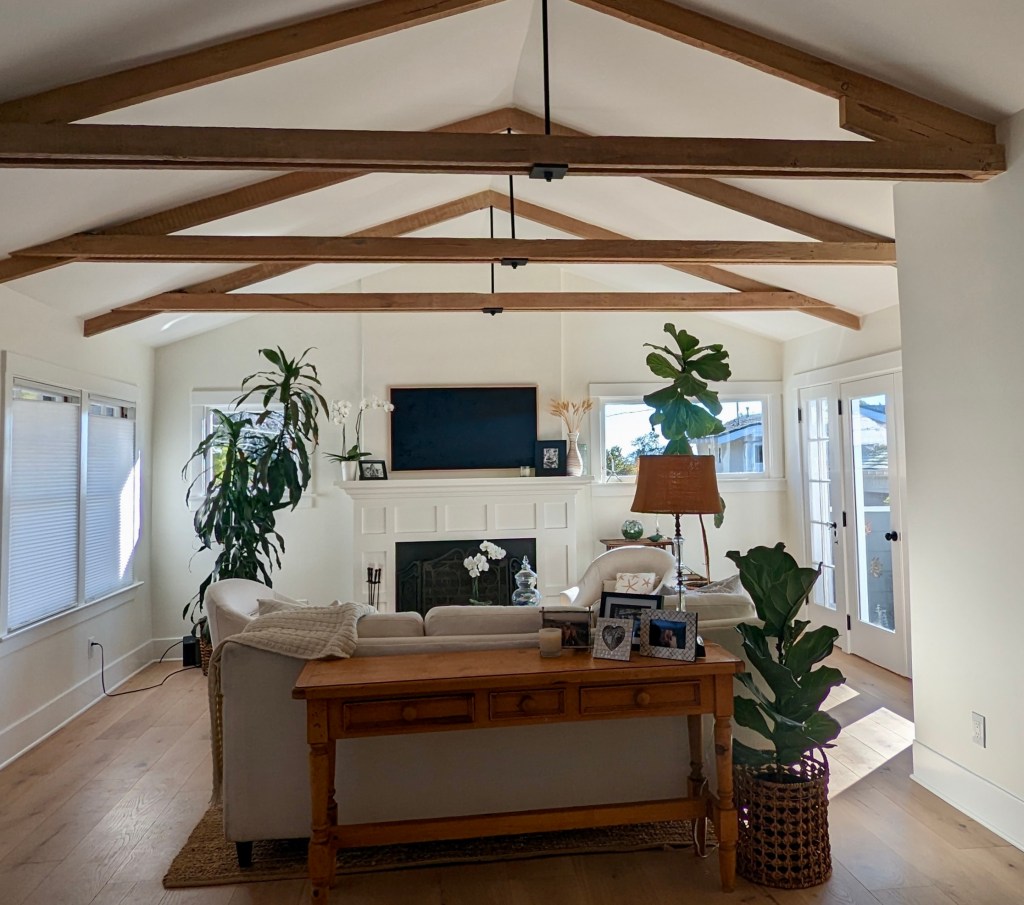 This “after” photo showcases how they’ve kept the bones — including “my” fireplace — and really transformed the space, including the incredible ceilings: