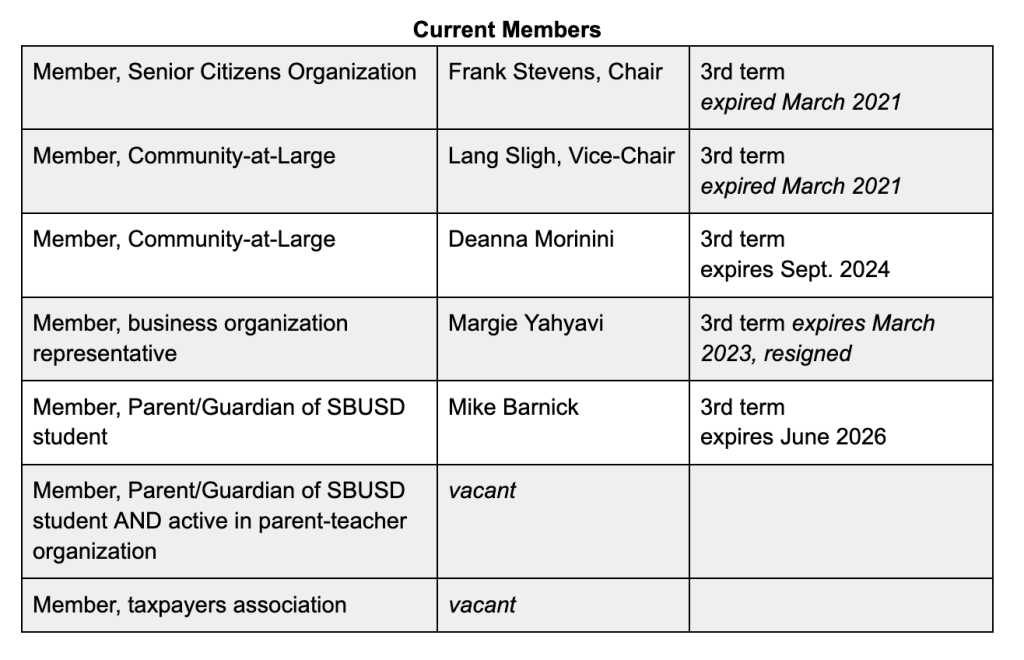 Santa Barbara Unified School District is accepting applications from interested citizens to serve on the District’s independent oversight committee with respect to its general obligation bonds, approved by District voters at the November 8, 2016 election and known as Measure I and J. The Committee consists of seven members, who meet quarterly to review and report on expenditures of funds to ensure bond money is used only for voter-approved purposes. At this time, there are five vacancies on the Committee that the Board seeks to fill (see attachment for current member terms and expiration dates):