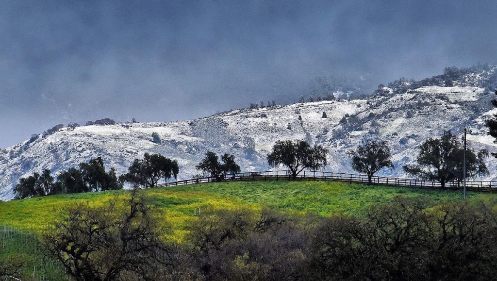There’s snow in our backyard! This brilliant view from Thursday contrasts a bright-green Santa Ynez hillside with the snowy Los Padres National Forest as a backdrop. With a blizzard warning for the mountains, and snow expected down to 1,000 feet, we’ll likely see more rain and stormy conditions early next week. My friend Mike Eliason captured the beautiful shot above, as well as this scene from East Camino Cielo: