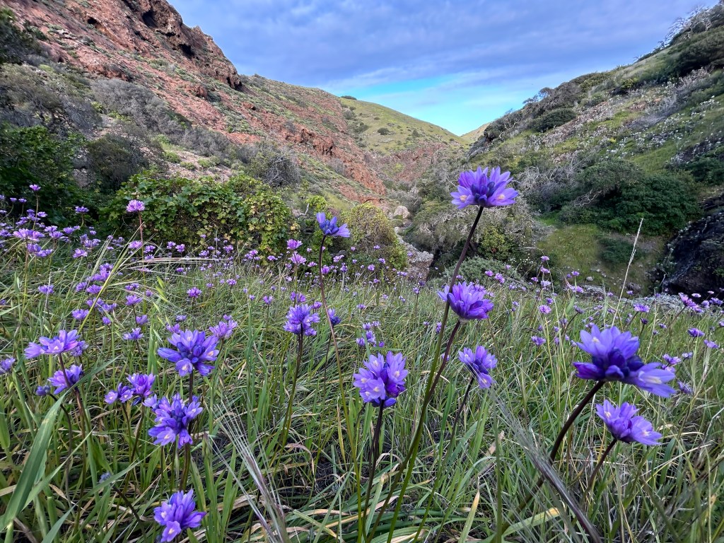 The sweet aroma of island ceanothus and silver lupine was thick in the air, wafting in and around the rocky, honeycombed canyon. Pacific green tree frogs croaked mightily throughout the seasonal arroyo. A shy island fox peeked around the corner of a blooming lemonade berry bush as I watched from behind spindly stocks of swaying blue dicks.