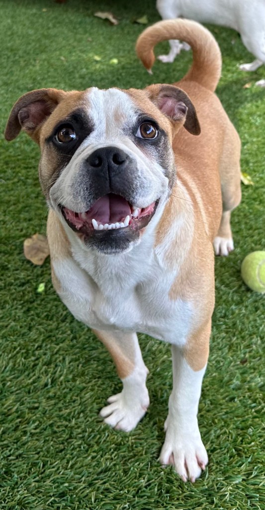 This super friendly little 1 year old Bulldog/Pug mix is such a love bug! You will be hard pressed not to find her with her tail wagging. She is such a happy go lucky kind of gal! Lucy would make a great addition to any home. She is fully vaccinated, Spayed, crate trained, well mannered and house broken. She loves adventures in the car or walks on the leash.