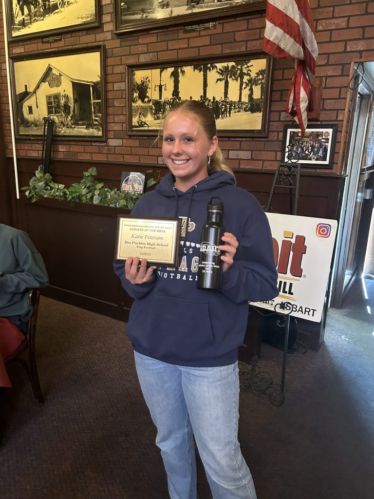 Asher Smith of Carpinteria boys’ water polo and Katie Peterson of Dos Pueblos flag football received SBART Athlete of the week awards at Monday’s press luncheon.