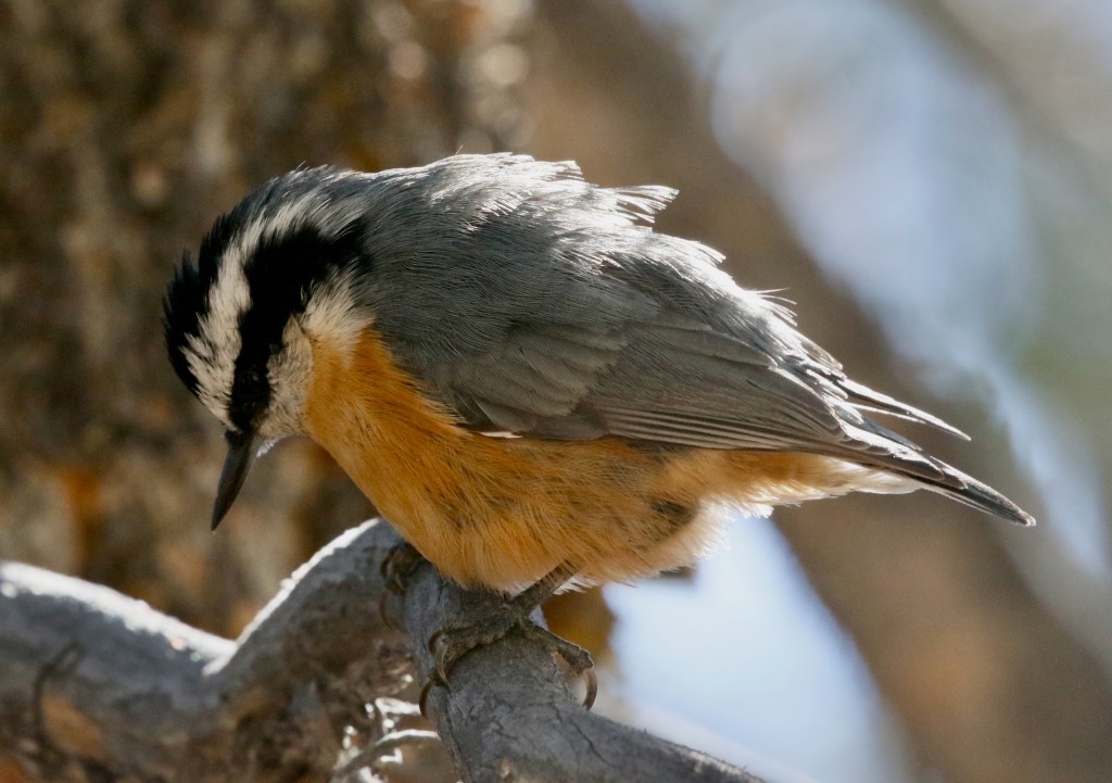 The first sign that you have red-breasted nuthatches in your neighborhood is hearing their distinctive call — a repetitive nasal note that sounds a bit like the tooting of a child’s tin horn. Like all nuthatches, the red-breasted forages mostly on trunks and the larger limbs of trees. Nuthatches are one of the few birds that are as comfortable traveling headfirst down a trunk as much as they are climbing upward. They are a bird of coniferous forests, but in irruption years, they will utilize just about any kind of tree. Last week on Santa Cruz Island, a number of birds were in a eucalyptus grove, searching for bugs under the papery bark.