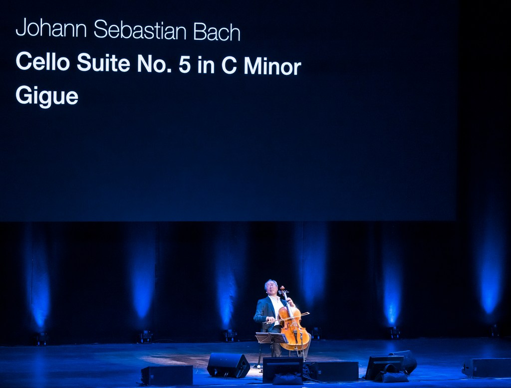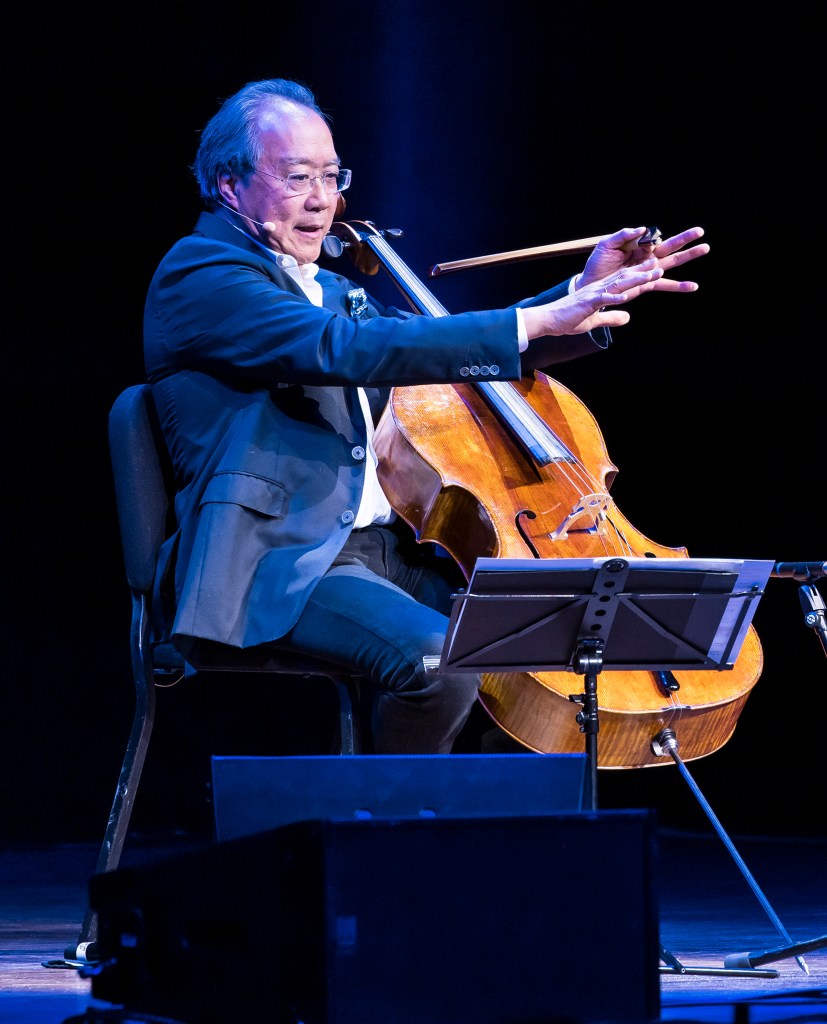 Among the many projects and merits of Ma’s musical saga, he has been closely aligned with and much praised for his measured and passionate relationship with the towering Bach Cello Suites (all six of which he performed in a single Granada Theatre performance several years ago). It can be reported that the Suites were the deepest touchstone of the Arlington performance/presentation, a source to which he repeatedly turned when giving examples of his musical wisdom and ethos.