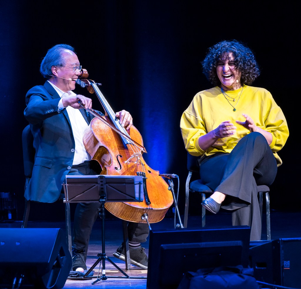 Ma’s hybrid recital, interspersed with extensive detours into his life story and humanistic philosophy, aided by multimedia visuals and an affable tête-à-tête with author Samin Nosrat (Salt Fat Acid Heat), was a unique and moving experience. Dubbed An Evening with Yo-Yo Ma, Reflections in Words and Music, this was also the latest of many Ma appearances hosted by UCSB Arts & Lectures, under the guidance of soon-to-retire director Celesta Billeci.