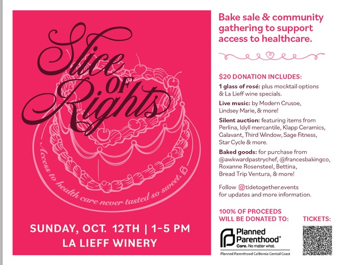 Join us for Slice of Rights, a community fundraiser that blends sweet treats with social impact! We’re bringing together local businesses, neighbors, and supporters for an afternoon full of gourmet baked goods, silent auction items, and meaningful connections — all in support of expanding access to healthcare. All proceeds will be donated to Planned Parenthood of California Central Coast.