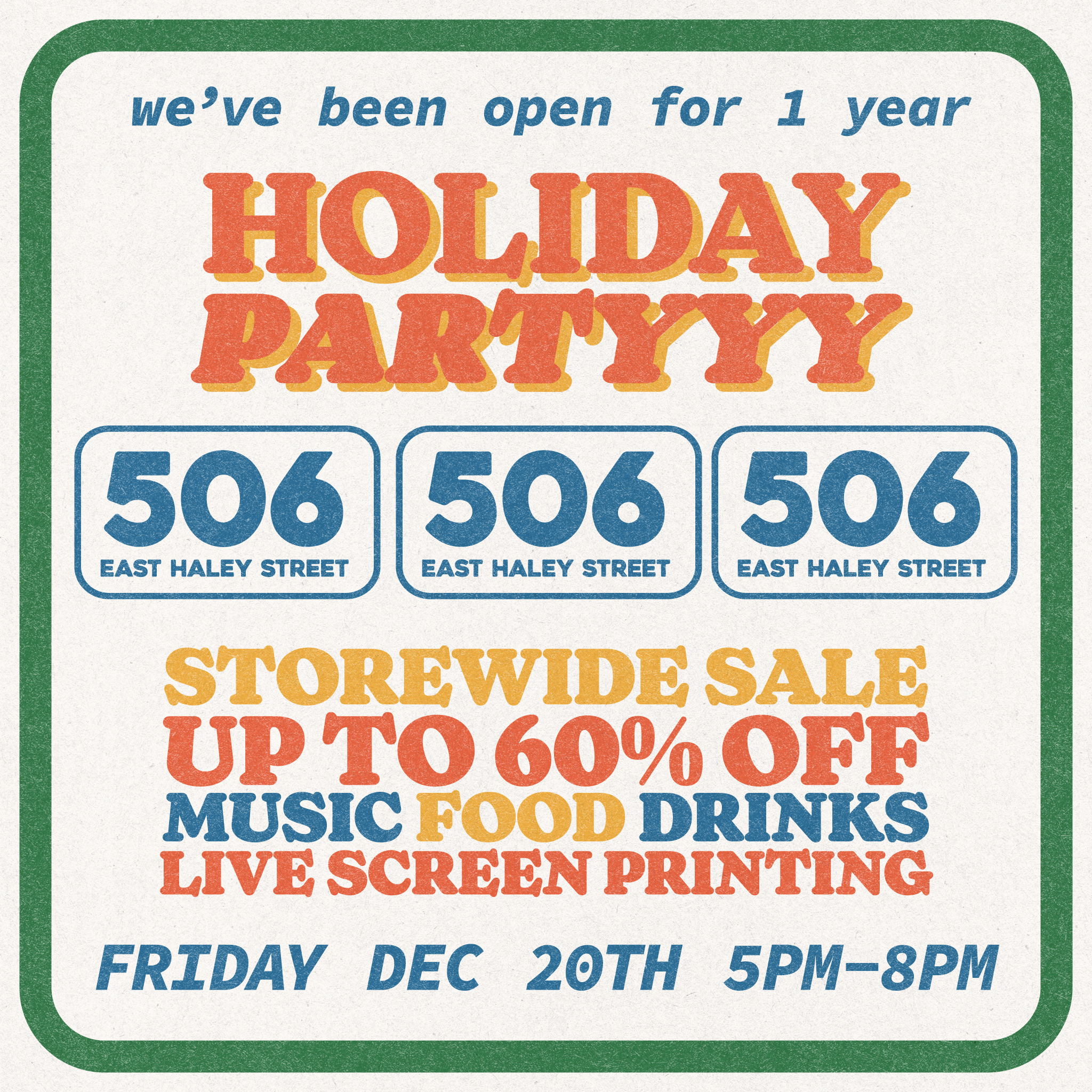 We’re are celebrating 1 year of being open with a fun Holiday party for all – we’ll have food and drink, music, live screen printing and Holiday Cheer going strong from 5pm-8pm Friday December 20th. Plus a storewide SALE with savings of up to 60% off!!