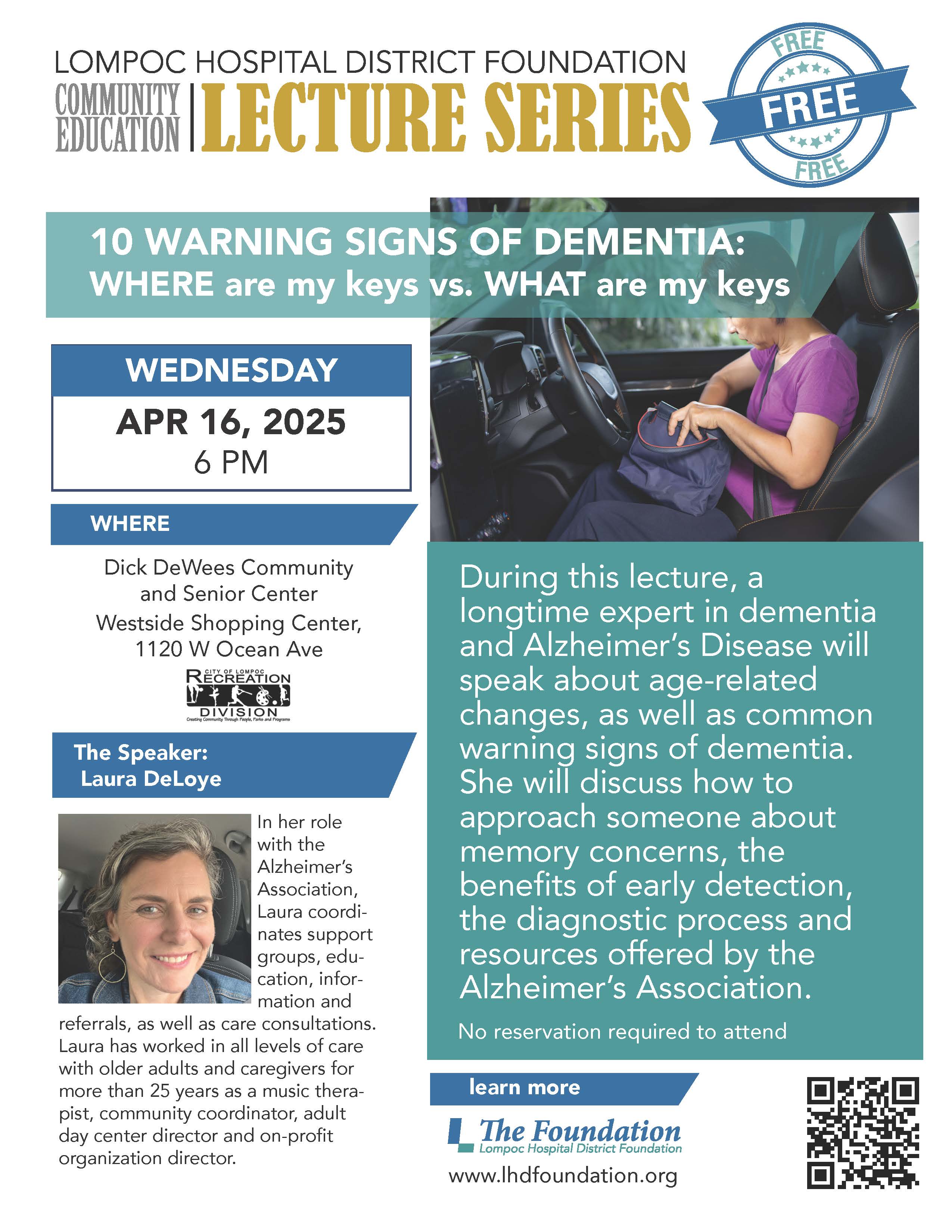 Laura DeLoye, who has an extensive background in Alzheimer’s disease and dementia, will give a free lecture April 16 in Lompoc on the “10 Warning Signs of Dementia.”